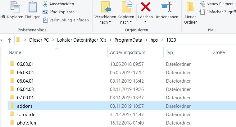 So bin ich vorgegangen: Ich habe den Pfad C:\ProgramData\hps aus Nr. 2 von Sylkes Anleitung mit STRG+C kopiert und mit STRG+V in die Adressleiste im Windows Explorer eingefügt. Enter. So schaut es dann aus: Danach Doppelklick auf den Ordner mit der Zahl (bei mir 1320) und dann sehe ich u.a. den Addon-Ordner und kann ihn löschen. Nachtrag: Für manche Aktionen musst Du Administrator-Rechte haben. Ich weiß nicht, wie Du die Benutzerkonten an Deinem PC eingerichtet hast. Liebe Grüße