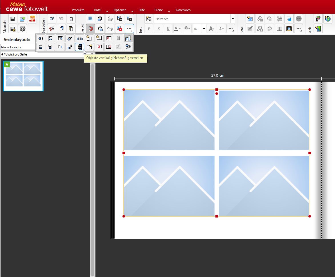 freut mich, dass Sie dieses Thema für sich klären konnten. Zum zweiten Punkt - Sie können ein bestehendes Layout anpassen oder ein neues erstellen und dann mit der Funktion "Layout speichern" speichern. Dieses können Sie dann mit der Funktion "Layout auf diese Doppelseite" oder "Layout auf alle Doppelseiten" legen. Klicken Sie auf die folgenden Bilder, um diese größer darstellen zu können. Sollten dahingehend noch Fragen offen sein, unterstütze ich Sie sehr gern. Layout speichern: Layout anwenden: Objekte gleichmäßig verteilen: Sylke Re: Größe der Fotos im BuchSchön wäre es wenn ich auch ein Doppelseiten Layout speichern könnte. Leider geht immer nur eine Seite. Muss mich dann manchmal durch meine Layouts durchackern bis ich dann das Gegenstück finde.