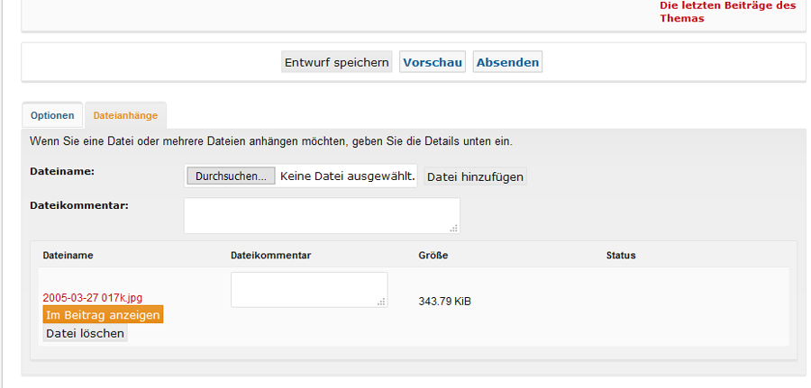 die Datei darf höchstens 900 Px in Breite/Höhe haben und eine Dateigröße von höchstens 500 kb haben. Dann scrollst Du zum Ende des Eingabefelds und klickst auf "Dateianhänge". Wähle die entsprechende Datei aus und klicke "Datei hinzufügen". Dann kannst Du nach dem Hochladen den Beitrag absenden. Gutes Gelingen! Liebe Grüße