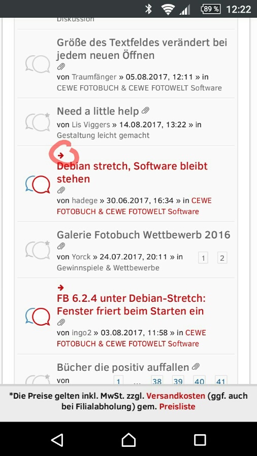 Re: Wartungsmodus 26.04.2017@Josefia: der kleine Pfeil vor (oder über) dem Titel springt (bei mir wenigstens) nicht zum letzten Beitrag sondern willkürlich irgendwo in die Mitte der letzten Seite. Ausserdem - woher soll man die Rolle des Pfeilchens bitte auch wissen? PHPBB bietet mehrere Möglichkeiten dafür (uA. zB. das Datum des letzten Beitrages anklicken usw.) und in der PC-Variante kann man den letzten Beitrag auch tatsächlich anwählen. In der Mobilen Version ist auch das nicht gelöst, in Gegensatz zu anderen Foren. Irgendwie schlampig das ganze... wie gesagt, typisch heutiger Trend: schnellschnellschnell neuneuneu auch wenn es (noch) Schrott ist... ärgert mich. Müsste nicht sein. Solide und zuverlässig wäre viel wichtiger als neuneuneu.