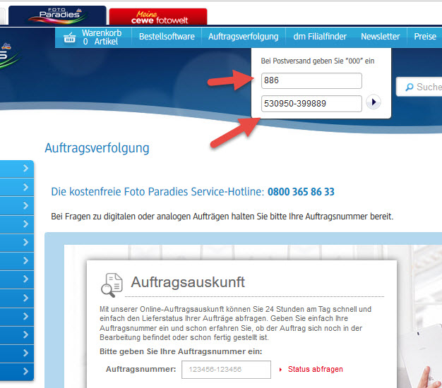 Meine Auftragsauskunftsseite von dir, wo ich hingeleitet werde (http://cewe.dm-paradiesfoto.at/auftragsauskunft.html) sieht total different aus. Bei http://www.dm-paradiesfoto.at/ sehe ich keine Tabs oben wie bei dir für DM und CEWE, ich sehe nur die DM. Ich habe dann (d)eine gefunden, mit http://fotobuch.dm-paradiesfoto.at/, wo ich die Tabs auf deinem Bild sehe. Meine Fie Filialnummer oben eingetragen und die nummer dann unten, bekomme ich die höfliche Formulierung endlich mit -------------------- Ihr Auftrag Aktuelles Datum: 12.01.2016 Zu diesem Auftrag können wir leider zur Zeit noch keine Auskunft geben. -------------------- Allerdings nicht in dem CEWE-Popup, wie auf deinem Bild, sondern in der blauen Fotoparadies-Maske - aber das ist auch egal. Mal schauen, ob da morgen oder übermorgen etwas "vernünftiges" erscheint. Wahrscheinlich, denn mit einer "alten" Nummer hat es die korrekten Daten angezeigt. (für eine apselut unmögliche Nummer schreibt er allerdings auch die gleiche höfliche Formel, aber das ist ja auch egal). Wenn ich hier etwas sehe, werde ich die anderen Seiten auch checken und hier berichten. Ich danke auf jeden Fall sehr für deine Hilfe! Bis dann, LG Nat LG Old Nat, der Dino