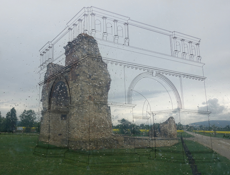 Re: Challenge 11/2018 • DurchblickErst wenn man durch die Schautafel mit dem rekonstruierten Umriss blickt, hat man den Durchblick: das Heidentor von Carnuntum (bei Bad Deutsch-Altenburg, NÖ) war gar kein einfaches Tor, sondern ein vierseitiges Triumphalmonument (ca. Mitte 4. Jh. n. Chr.).