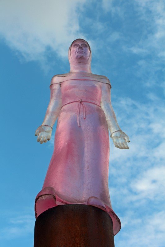 Die Skulptur stellt Mechthild von Magdeburg dar, die vom Fürstenwall über die Elbe blickt. Das Komische daran: Die Skulptur besteht aus durchsichtigem Kunststoff, so war das auch geplant - die Durchsichtigkeit. Was man nicht bedacht hat, war, dass sich der Kunststoff bei starker Sonneneinstrahlung verfärbt, weshalb die Dame bei Sonne rosa bekleidet ist Aber wenn ich ehrlich bin, gefällt sie mir in rosa erheblich besser wie farblos - obwohl, farblos habe ich sie noch nie gesehen, weil ich immer bei Sonne in Magdeburg bin