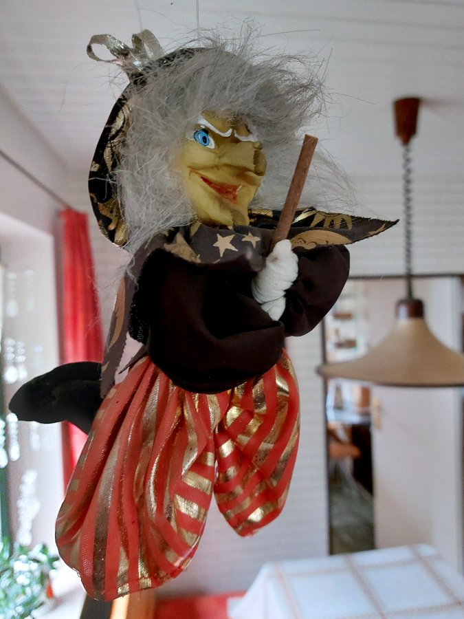 Re: Halloween Special - Woche 3Mit Halloween-Symbolen bin ich zuhause nicht gut bestückt, einzig eine Hexe fliegt durch unser Wohnzimmer. Eigentlich ist sie eine Brockenhexe, die zur Walpurgisnacht ihr Unwesen treibt, aber jetzt habe ich gelesen, dass Aber- und Volksglauben wissen, dass ihre Kräfte ausgerechnet in der Halloween-Nacht am stärksten ist …