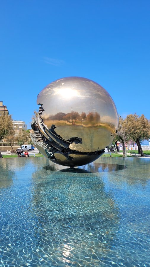 Bin grad in den Marken, gestern in Pesaro. Dort steht am Meer ein Kunstwerk aus Bronze, in dem sich sowohl das Wasser des Brunnens spiegelt als auch die Bäume im Park. Mit ganz guten Augen kann man sogar mich, die Fotografin, erkennen
