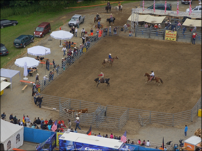 Eine Möglichkeit zu ungewöhnlichen Ansichten für ein deutsches Rodeo, bot sich mir im Fort Fun im Sauerland. In diesem freizeitpark stand die Arena unterhalb des Riesenrades und so hatte man aus luftiger Höhe nicht nur einen tollen Fernblick, sondern auch eine schöne Übersicht über die Arena und das Publikum. SONY A 500 85mm f/ 9 1/250 sek ISO 400 Wenn ich keine Bilder bekomme,