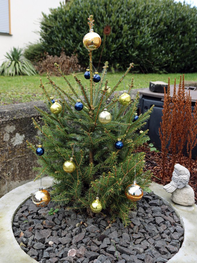 Mein Sohn hat vor ein paar Jahren ein winziges Bäumchen gerettet, das in der Dachrinne eines Betriebs sein trauriges Dasein gefristet hat. Ich habe es dann eingetopft und zwei oder drei Jahre im Topf wachsen lassen. Nachdem wir letztes Jahr unsere Nordseite ein bisschen aufgehübscht hatten, durfte das Bäumchen in dem 50 Jahre alten Ausgleichs-Beton-Ring eines Schachts weiterwachsen, der im Keller nur Platz gekostet hat. Da wir seit Jahren keinen Weihnachtsbaum mehr in der Wohnung haben, kam mein Mann auf die Idee, den alten Christbaumschmuck teilweise an das Bäumchen zu hängen. So sieht es heute aus: Liebe Grüße