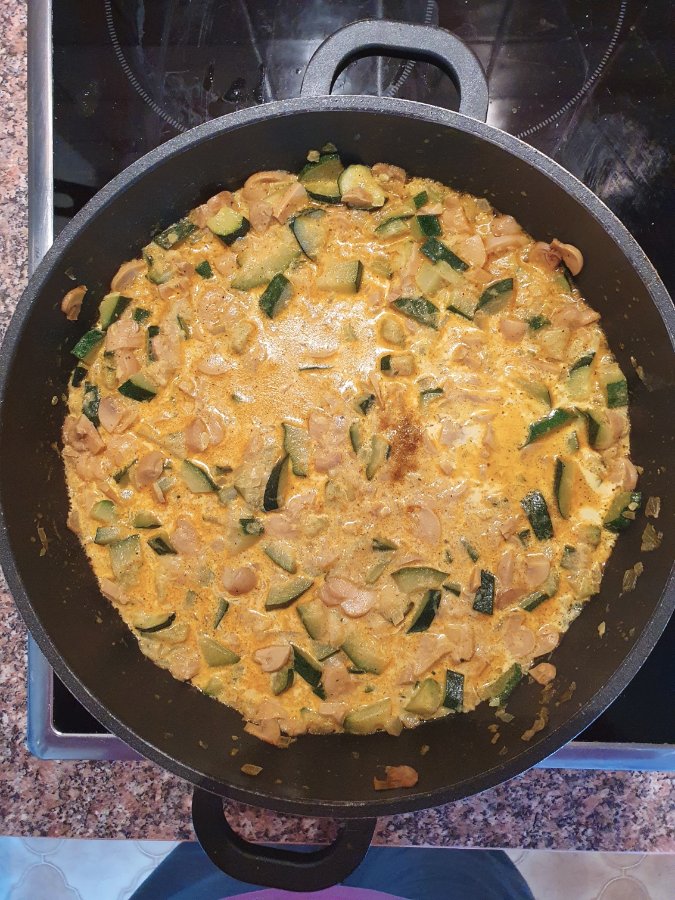 Ist es auch und ganz einfach... Nur Zucchini, Zwiebel, eine Dose Pilze, süße Sahne, Curry, Paprikapulver, Salz, Pfeffer. Dazu Spaghetti...