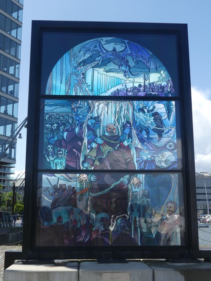Re: Sommerspecial Nr. 1: Abkühlung gefällig?Kühle Farben auf einem von 6 grossen Buntglasfenstern, den "Glasses of Thrones", die in Belfast verteilt sind und eine Hommage an die Serie "Game of Thrones" sind, von der viele Szenen in Irland und Nordirland gedreht wurden. Dieses steht neben der SS Nomadic vor dem Titanic Museum.