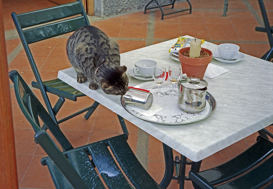 Fokussy Re: Challenge 07/2018 • Oops!Während unseres ersten Urlaubes 1998 auf Madeira haben wir in der Cafeteria des Tropical Garden Monte Palace ein Kätzchen am Nebentisch beobachtet, das unbedingt an das dort stehende Milchkännchen heran wollte. Kurzer Sprung auf die Tischplatte, dann das Kännchen umgeworfen und die verkleckerte Milch aufgeschleckt! Leider gab es damals keine Digitalkameras und auch Serienfotos konnte ich nicht schießen, deshalb habe ich nur den Anfang und das Ende der Geschichte auf Film gebannt.