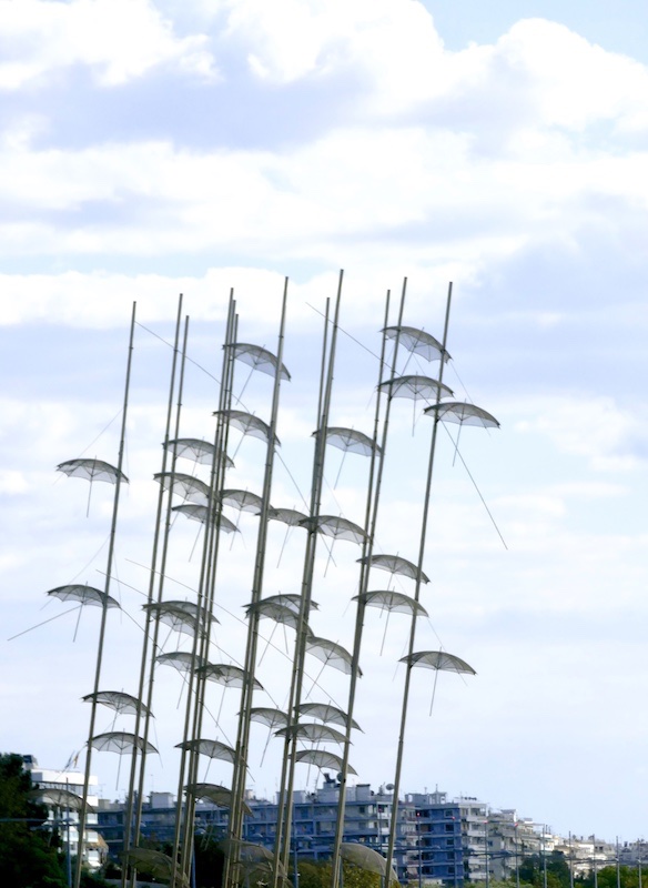 Re: Challenge 02/2019 • I'm singing in the rain!Hier eine Schirm-Installation von Giorgos Zongolopoulos am Rande der City von Thessaloniki. Man kennt sie vom Fernsehen: Sie steht auch im Ehrenhof des EU-Ministerrats in Brüssel. Ich habe sie zum ersten Mal auf der Biennale in Venedig 1995 gesehen und fand sie schon damals anmutig und poetisch.