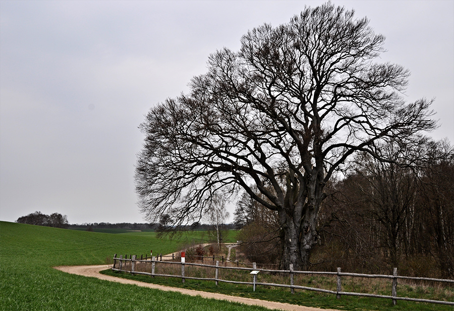 Hier die wahrscheinlich älteste Buche in Mecklenburg. Stark vom Pilz befallen, ist ihr langsames Absterben nicht mehr aufzuhalten. Um nicht die Säge ansetzen zu müssen (Wegsicherungspflicht), wurde sie weiträumig abgesperrt und auf dem daneben liegenden Feld provisorisch ein Weg für Fußgänger und Radfahrer angelegt. Liebe Grüße