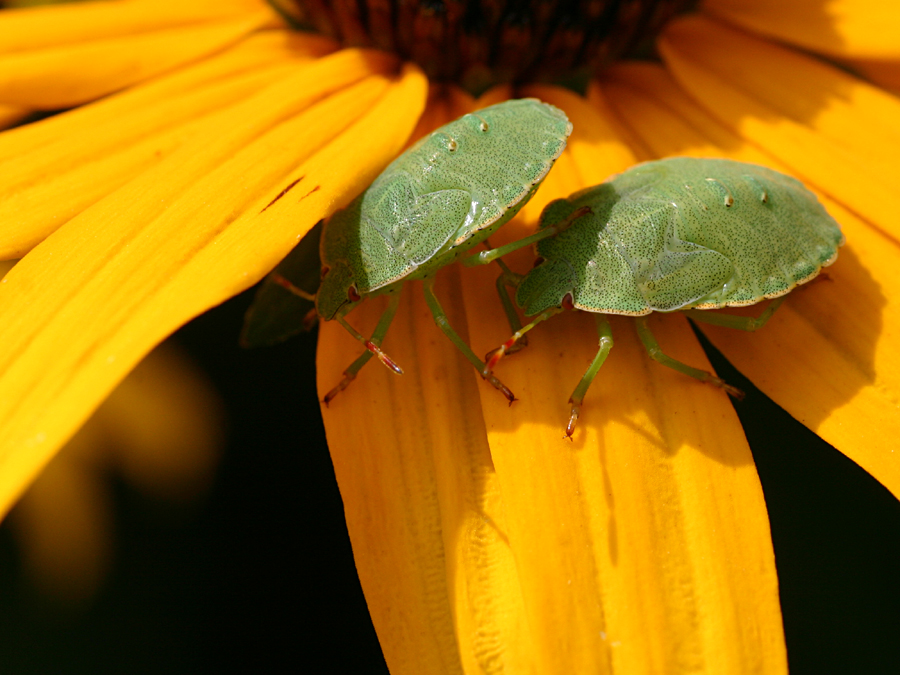 Grüne Stinkwanzen auf Sonnenhut, eine leuchtende Farbmischung. Kleine Spinne in der Blüte meines weißen Fingerstrauchs: Liebe Grüße