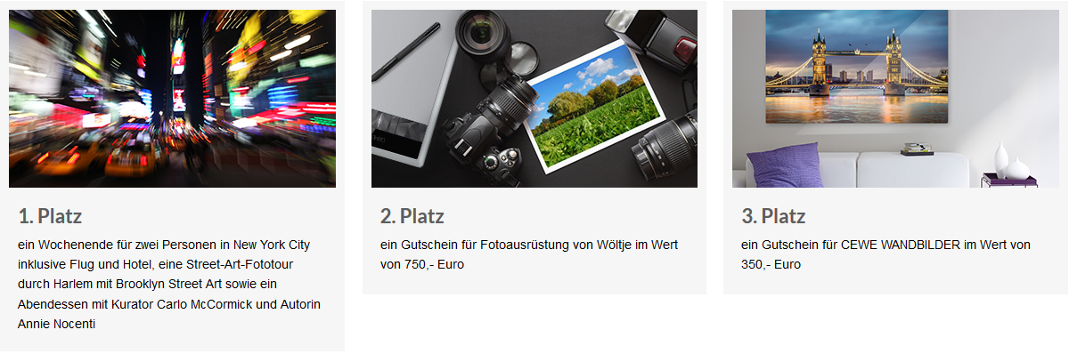 01.10.2016 – 08.01.2017 Wir nehmen den Start der Ausstellung "Magic City – Die Kunst der Straße" mit der Weltpremiere in Dresdens Kultur-Quartier Zeitenströmung zum Anlass für eine Entdeckungsreise durch unsere Städte. Dafür suchen wir gemeinsam mit SC Exhibitions Ihre besten City-Impressionen. Zeigen Sie uns Ihre Lieblingsecken, urbane Architektur, bewegte Straßenszenen, faszinierende Menschen oder den Zauber des Nachtlebens – zeigen Sie uns die Magie Ihrer Stadt! Als Hauptgewinn lockt ein Wochenende für zwei Personen in New York City inklusive Flug und Hotel (citizenM am Times Square), eine Street-Art-Fototour durch Harlem mit Brooklyn Street Art sowie ein Abendessen mit Kurator Carlo McCormick und Autorin Annie Nocenti. Als Reisezeitraum wird das Frühjahr 2017 angesetzt. Der zweite Preis ist ein Gutschein für Fotoausrüstung von Wöltje im Wert von 750,- Euro. Als dritten Preis vergeben wir einen Gutschein für CEWE WANDBILDER im Wert von 350,- Euro. Die Plätze 4 bis 10 gewinnen jeweils einen Gutschein für CEWE Fotoprodukte im Wert von 50,- Euro. Alle Siegerfotos werden in der CEWE & SC Exhibitions Gallery in der Münchener Ausstellung gezeigt, die parallel zur Magic-City-Premiere am 13. April 2017 eröffnet. Jetzt mitmachen! Wir wünschen viel Erfolg! Sylke Re: Wettbewerb: Magic City – Die Magie meiner StadtDie Gewinner stehen fest: https://contest.cewe-fotobuch.de/magic- ... de/winners