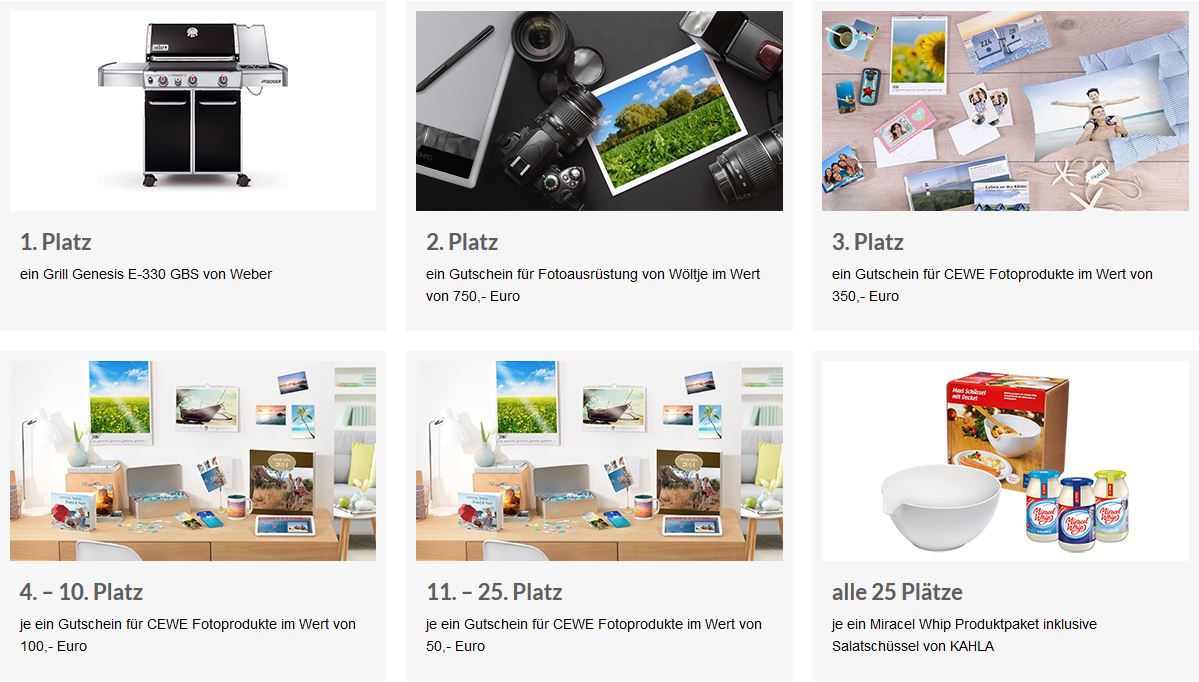 23.10.2017 – 28.02.2018 Ob in Gesellschaft oder allein: Ein leckeres Essen sorgt für das kleine Glück im Alltag oder den großen Genuss bei besonderen Anlässen. Wir freuen uns auf Ihre kulinarischen Momentaufnahmen, aus denen wir ein perfektes "Gewinnermenü" zusammenstellen möchten. Mitmachen lohnt sich: Mit Ihren besten Fotos haben Sie die Chance, einen von 25 attraktiven Preisen zu gewinnen. Als Hauptgewinn lockt ein ein Grill Genesis E-330 GBS von Weber im Wert von 1.599,- Euro. Der zweite Preis ist ein ein Gutschein für Fotoausrüstung von Wöltje im Wert von 750,- Euro. Als dritten Preis vergeben wir einen Gutschein für CEWE Fotoprodukte im Wert von 350,- Euro. Die Plätze 4 bis 10 gewinnen jeweils einen Gutschein für CEWE Fotoprodukte im Wert von 100,- Euro, die Plätze 11 bis 25 im Wert von 50,- Euro. Zudem erhalten alle Gewinner ein Miracel Whip Produktpaket inklusive Salatschüssel von KAHLA. Jetzt mitmachen! Wir wünschen viel Erfolg! Sylke