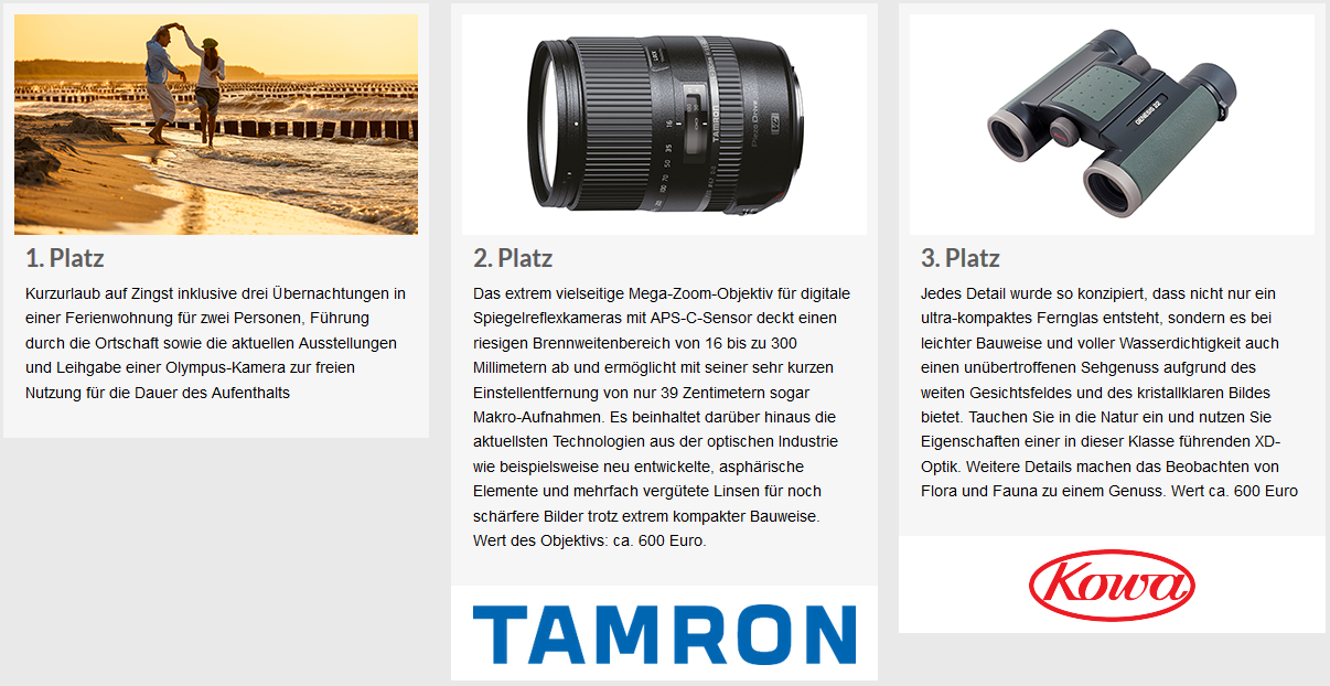 01.04.2018 – 31.10.2018 Urlaub im Norden – Sonne, Wind und Wellen, ein Fels in der Brandung, am Horizont ein Schiff, das Gelb der Rapsfelder, ein Kuss bei Sonnenuntergang in den Dünen, Strandkorb-Leben, ein Fischbrötchen im Hafen, aufregende Begegnungen und über allem die Möwen. Es heißt, der Norden macht glücklich. Teilen Sie mit uns und allen Fotobegeisterten Ihre glücklichsten festgehaltenen Momente zwischen Land und Meer! Als Hauptgewinn lockt ein Kurzurlaub auf Zingst inklusive drei Übernachtungen in einer Ferienwohnung für zwei Personen, Führung durch die Ortschaft sowie die aktuellen Ausstellungen und Leihgabe einer Olympus-Kamera zur freien Nutzung für die Dauer des Aufenthalts. Der zweite Preis ist Mega-Zoom-Objektiv von Tamron. Als dritten Preis vergeben wir ein Fernglas Genesis 22 Prominar von Kowa. Die Plätze 4 bis 10 gewinnen jeweils einen Gutschein für ein CEWE FOTOBUCH im Wert von 50,- Euro. Jetzt mitmachen! Wir wünschen viel Erfolg! Sylke Wer ist online?Mitglieder in diesem Forum: 0 Mitglieder und 21 Gäste