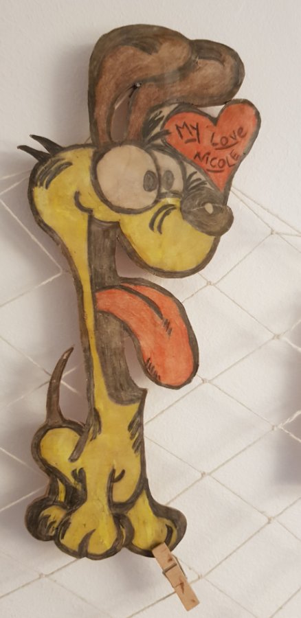Beim Suchen im Keller sind mir meine Tagebücher aus den Endsechzigern bis Mittsiebzigern in die Finger gekommen. Ein wahrer Schatz, den ich hüte bis zu meinem Tod. Ich lese darin, wie schmerzhaft die erste Liebe war und dass ich wohl nicht anders war als die Jugend heute. Den Liebesteil habe ich ausgeklammert, aber ich habe euch 2 andere Seiten fotografiert. Da stehen auf einer Seite Liedertexte und Weisheiten, die mir wichtig waren. Man bemerke: links der Text "Du" von Peter Maffay und rechts ganz unten einer der bekanntesten Sätze von Janis Joplin. Das hat damals noch zusammen gepasst Und da ist die eingeklebte Karte zum Konzert von Jethro Tull - für 10,- DM in Reihe 10 Re: Challenge 11/2020 • Für immer mein!Mein Vater hat damals, als ich geboren wurde mehrere solche Comicfiguren für mich gebastelt. "Odie", der Hund von "Garfield" ist die einzige Figur die ich noch immer habe! Das ist eine dünne Holzplatte, auf die er so ein altes, glattes Papier (keine Ahnung wie das heißt