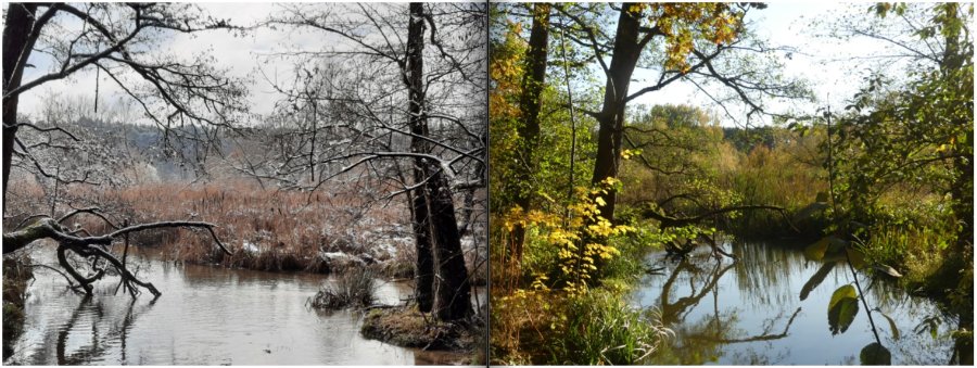 Hier habe ich 2 Bilder von der gleichen Stelle am Dechsendorfer Weiher gefunden, einmal im Februar 2021 bei klirrender Kälte und einmal im Spätsommer des gleichen Jahres bei bestem Wanderwetter aufgenommen. Viele Grüsse