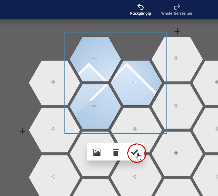hat geschrieben: Wenn bereits eine Gestaltung angelegt ist, ist das aktive hexxa mit Rahmen, die inaktiven abgedunkelt dargestellt. Nun bewirkt ein weiterer Klick auf ein aktiviertes hexxa das Löschen, d.h. beim Klick wird wie bei einem ungefüllten hexxa das "Minus aktiviert".