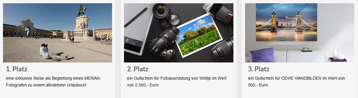 20.10.2016 – 20.10.2017 Unser Jahr ist in vier Perioden gegliedert, die sich vor allem klimatisch unterscheiden – und jede Jahreszeit hat ihren eigenen Reiz: Die Frische des Frühlings, die langen Tage des Sommers, die Unbeständigkeit des Herbstes oder die dämmrige Stimmung des Winters bieten ganz besondere Motive für jeden Fotografen. Wir freuen uns auf Ihre spannendsten Aufnahmen aus den vier Jahreszeiten und vom Wandel dazwischen. Außerdem haben Sie bei der Aktion "Leserfoto des Monats" die Chance, Ihr Foto exklusiv im MERIAN-Heft zu präsentieren. Als Hauptgewinn lockt eine exklusive Reise mit einem MERIAN-Fotografen zu einem attraktiven Urlaubsort. Hier bietet sich die Möglichkeit, dem Profi bei der Arbeit über die Schulter zu schauen und das Reiseziel selbst fotografischen zu entdecken. Der zweite Preis ist ein Gutschein für Fotoausrüstung von Wöltje im Wert von 2.500,- Euro. Als dritten Preis vergeben wir einen Gutschein für CEWE WANDBILDER im Wert von 500,- Euro. Die Plätze 4 bis 10 gewinnen jeweils einen Gutschein für CEWE Fotoprodukte im Wert von 100,- Euro. Außerdem erhalten alle Gewinner ein Jahresabonnement des Kultur- und Reisemagazins MERIAN. Wir wünschen viel Erfolg! Sylke Wer ist online?Mitglieder in diesem Forum: 0 Mitglieder und 23 Gäste