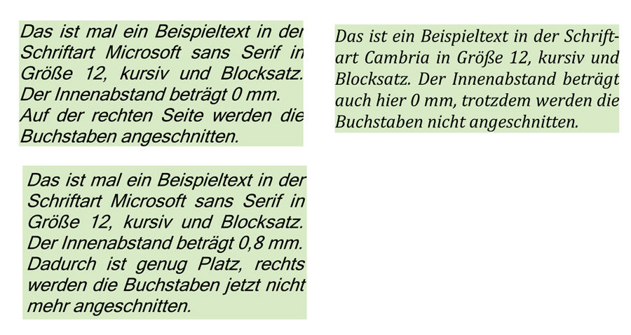 Egal wie ausladend ein Buchstabe links ist, das Textfeld schneidet links nichts ab. Ist die Schrift kursiv gestellt? Bei einigen Schriftarten schneidet das Textfeld rechts ab, wenn die Buchstaben kursiv gestellt werden. Dann kann man einfach die Breite des Innenabstandes vergrößern. (Der Innenabstand ist dann natürlich an allen Seiten vorhanden.) Hier mal Beispiele mit Fließtext, Blocksatz und "normalen" Schriftarten. Den Hintergrund der Textfelder habe ich zu Demonstrationszwecken farblich gestaltet. (Wobei mir in meinem Beispiel die zweite Schriftart, Cambria kursiv, wesentlich besser gefällt) Liebe Grüße