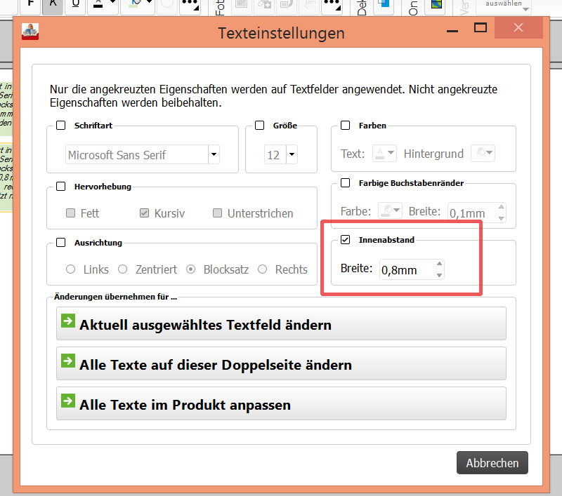 Liebe Frauke,Bei einigen Schriftarten schneidet das Textfeld rechts ab, wenn die Buchstaben kursiv gestellt werden. Dann kann man einfach die Breite des Innenabstandes vergrößern. Ich denke, dass sich Pitty dazu noch äußern wird. toller Lösungsvorschlag! Und ja, es könnte mit dem künstlichen Kursivstellen zu tun haben. Zur Schriftfamilie gehören mehrere Schnitte wie normal, fett und kursiv, aber auch schmal-fett, extra-fett usw., die eigens geschnitten werden. Programme wie word oder eben auch cewe bieten an, den normalen Schnitt künstlich zu "verfetten" oder schräg zu stellen. Diesen Schriften fehlt u.U. das richtige Nach- und Vorfleisch (s.o.) oder das richtige Kerning usw., das die Harmonie und die gute Lesbarkeit des Fonts ausmachen. Ich vermeide lange Texte in kursiv oder fett, da es sich um Auszeichnungen handelt. Wenn ich diese Schnitte für längere Texte brauche, nehme ich eine Schrift, zu der ich die Originalschnitte besitze und stelle nicht "künstlich" schräg. Aber der Lösungsvorschlag von Frau ist Spitze! Lieber Gruß, pitty