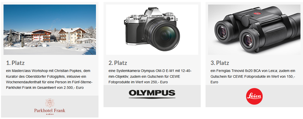 CEWE und der Oberstdorfer Fotogipfel laden Sie herzlich ein zum zweiten gemeinsamen Fotowettbewerb 15.03.2017 – 30.04.2017 Musik begleitet uns im täglichen Leben. Wir hören sie über diverse Medien, besuchen gezielt Konzerte oder sind selbst aktiv, etwa in einer Band. Gestalten Sie diesen Wettbewerb als musikalischen Raum aus Stillleben von Instrumenten, Impressionen von Events, Künstlern in Aktion und visualisieren Sie Musikstile mittels Fotografie: Von Klassik bis Punk, von Popmusik bis Underground – wir sind gespannt auf Ihre besten Aufnahmen. Als Hauptgewinn lockt ein Masterclass Workshop mit Christian Popkes, dem Kurator des Oberstdorfer Fotogipfels, inklusive ein Wochenendaufenthalt für eine Person im Fünf-Sterne-Parkhotel Frank im Gesamtwert von 2.500,- Euro. Der zweite Preis ist eine Systemkamera Olympus OM-D E-M1 mit 12-40-mm-Objektiv; zudem ein Gutschein für CEWE Fotoprodukte im Wert von 250,- Euro. Als dritten Preis vergeben wir ein Fernglas Trinovid 8x20 BCA von Leica; zudem einen Gutschein für CEWE Fotoprodukte im Wert von 150,- Euro. Die Plätze 4 bis 10 gewinnen jeweils einen Gutschein für CEWE Fotoprodukte im Wert von 100,- Euro und die Plätze 11 bis 50 im Wert von je 50,- Euro. Jetzt mitmachen! Wir wünschen viel Erfolg! Sylke Wer ist online?Mitglieder in diesem Forum: 0 Mitglieder und 21 Gäste