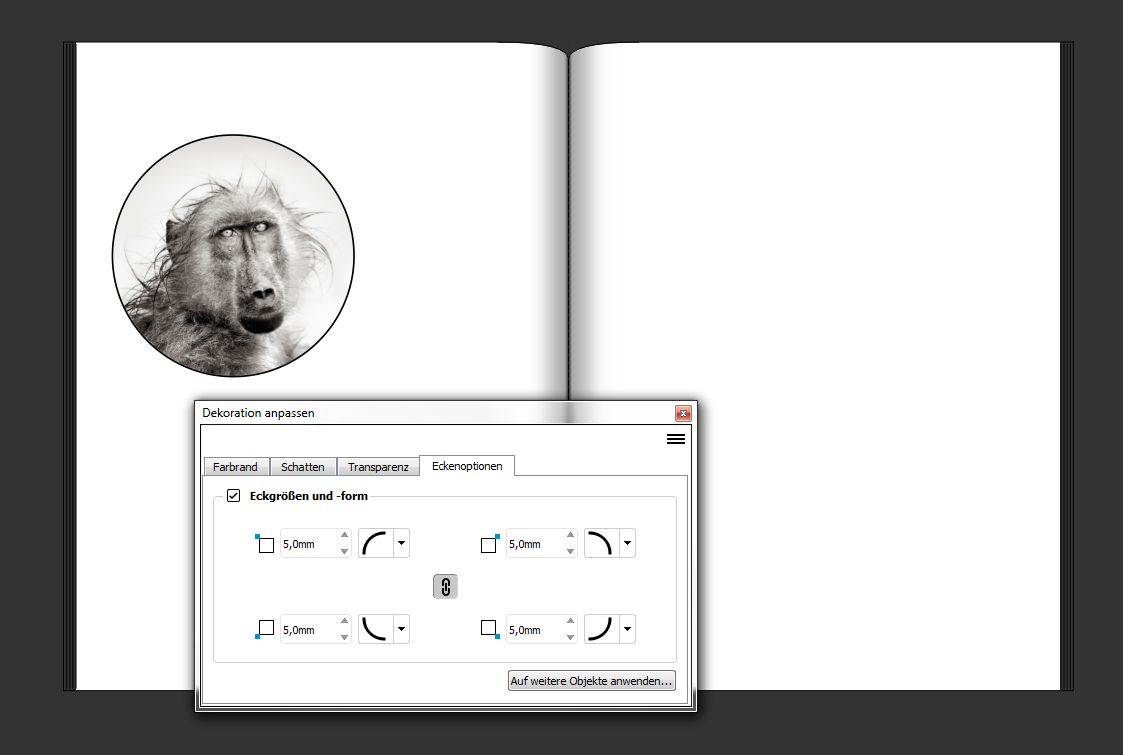 Sie können auch die neuen Eckenoption der Version 6.2.2 verwenden. Die Version können Sie im Forum herunterladen. Um das abgebildete Ergebnis zu erzielen, müssen Sie lediglich ein Bild einfügen und mit der Funktion "Größe, Position und Rotation" in die gewünschte Größe bringen. Die neue Funktion finden Sie in der Schaltflächenleiste. Sylke
