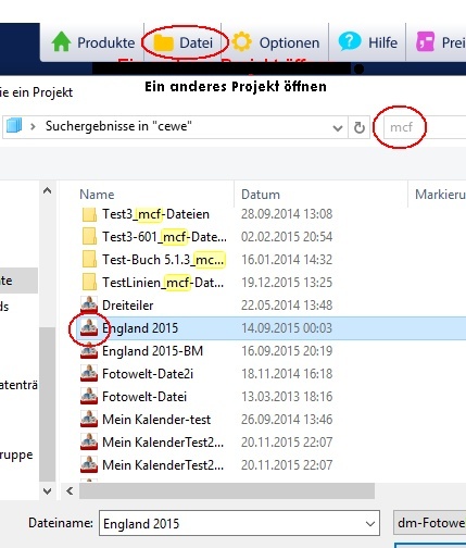 hast du die mcf-Datei im Explorer gesucht und gefunden oder den mcf-Dateien-Ordner? Im mcf-Dateien-Ordner sind nur die Bilder. Die mcf-Datei, mit der du dein Projekt öffnen kannst, liegt im selben (Über-)Ordner wie der Ordner mit den Bildern, siehe Screenshot. Ich habe da einen Ordner "cewe", dann einen Ordner "Test" und in diesem liegen der Bilderordner test_mcf-Dateien und die Projektdatei test.mcf (oder nur test, der Zusatz wird meist nicht angezeigt). Mit der Projektdatei test wird das Fotobuch geöffnet. Soviel zuerst mal zur Klärung, ob wir von den gleichen Dingen sprechen ![]() Versuche mal, über das CEWE-Programm dein Fotobuch zu finden. Dazu gehst du auf "Datei" und dann "Ein anderes Projekt öffnen". Nun suchst du im Explorer, der sich öffnet, deinen Cewe-Überordner bzw. Tagebuch-Ordner, je nachdem, wo du dein gesuchtes Fotobuch vermutest. Dann gibst du oben rechts im "... durchsuchen"-Feld "mcf" ein. Nun werden dir alle Cewe-Elemente im Ordner angezeigt. Schau, ob du dort deine Projektdatei findest. Die Projektdateien werden (bei Normal-Sortierung) unterhalb der Ordner angezeigt. Ich hänge auch einen Screenshot dazu (aus meinem Testbereich) an. Ich hoffe, das hilft dir weiter. Erst mal viel Erfolg. Falls es nicht klappt, melde dich nochmal.