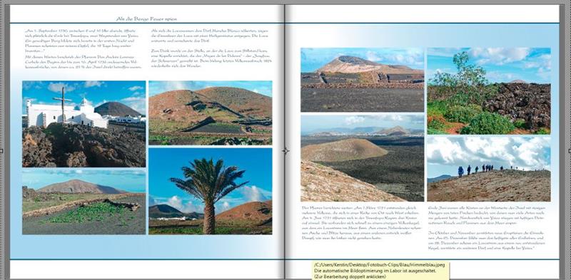 Nein, die Fotos sind nicht nochmal bearbeitet worden und auch die Blautöne waren das gleiche Blau (ich hab ja meine eigenen Farbbilder für Hintergrundgestaltung angelegt), evtl. liegt es einfach daran, dass ich die Seiten mit Snipping Tool ausgeschnitten und dann nochmals verkleinert habe. Ja, die Schriftart auf denM Buchrücken ist (gewollt) eine andere. Ich habe bislang alle Buchrücken in Cataneo beschriftet und dann sieht es im Bücherschrank einheitlich aus (nein, ich bin nicht pingelig Für die Rückseite des Covers fehlt mir noch etwas Inspiration, aber bis zum fertigen Buch ist es eh noch ein langer Weg... Vielen Dank für Eure Hilfe. Re: TextplatzierungIch gestehe: spontan war ich für die Version Nr. 2, aber nach Überarbeitung mit Berücksichtigung der tollen Tipps gefällt mir das Ergebnis der Doppelseite gut. Es wäre eigentlich nichts mehr zu sagen.