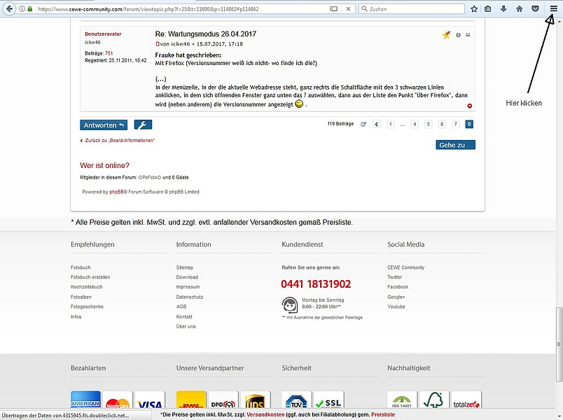 Re: Wartungsmodus 26.04.2017Ich habe auch Firefox 54.0.1. Das muss ich wohl ändern lassen.