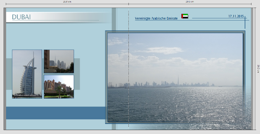 Ich persönlich finde die Schrift aber zu groß, wenn es tatsächlich auf jeder Seite erscheint. Außerdem hat man irgendwann ja mal kapiert, dass man jetzt in Dubai ist. Deshalb wäre es evtl. eine Idee, lieber hinzuschreiben, welches Gebäude, Stadtteil etc. das ist. Nur meine Gedanken dazu ... Viel Spaß weiterhin beim Gestalten. Gruß DSL-schnell