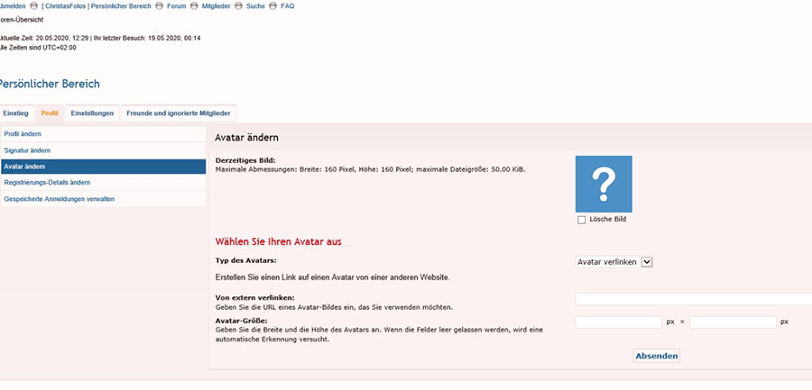 Du musst hier die Auswahl rechts neben "Typ des Avatars" auf "Avatar hochladen" ändern. Momentan steht dort bei Dir "Avatar verlinken".Kann mir jemand sagen, warum es bei mir nur möglich wäre, einen link hinzuzufügen? Es sollte doch 'durchsuchen' aus dem eigenen Rechner auch hier aufscheinen? Profilbild_kl.jpg Danke für Hilfe! Liebe Grüße