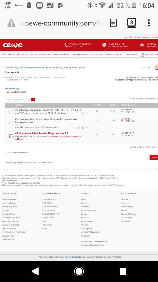 Wir laden Sie herzlich ein, die neue CEWE Community mit integriertem Forum zu entdecken und künftig zu nutzen. Das bisherige Forum, in dem Sie sich gerade befinden, steht nur noch bis Ende 2025 für neue Beiträge zur Verfügung und wird ab dem kommenden Jahr 2026 nur noch lesend zugänglich sein. Informieren und registrieren Sie sich jetzt in der neuen CEWE Community – wir freuen uns auf Sie! Smartphone-Ansicht des ForumsSeit kurzem, möglicherweise (?) seit der Umstellung auf das Winter-Layout, ist die Anzeige des Forums auf dem Smartphone wieder winzig klein, d.h. es wird die Desktop - Version angezeigt anstatt der mobilen. Ich habe auch schon den Cache gelöscht, aber es ändert sich nichts. So ist das Forum unglaublich schwierig zu lesen und zu nutzen. Liegt das an meinem Smartphone oder an der Forensoftware?