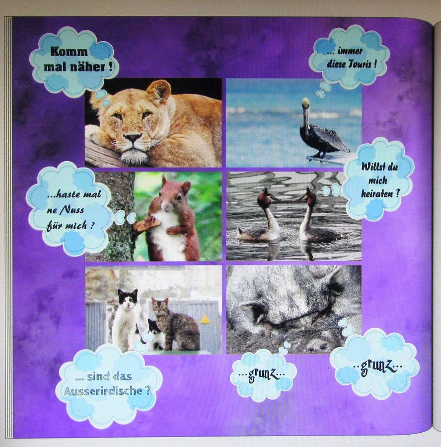 Dafür habe ich vorerst die Fotos in der Fotoschau mit dem Gammafilter und dem Stilisierungsfilter "Ölgemälde" bearbeitet. Leider wird die Veränderung trotz Bestätigung nicht ins Fotobuch übernommen (jedenfalls bei mir nicht). Ich musste mir daher behelfen und habe von der Bearbeitung in der Fotoschau ein screenshot gemacht und diesen dann eingefügt. Anschließend wurden die Fotos mit Masken belegt, Sprechblasen und Texte eingefügt. Die Doppelseiten haben noch verschiedene Hintergründe und die Fotos sind leicht transparent, damit alle Elemente farblich harmonieren. Lange Erklärung - hier ist es: Lieber Gruß, pitty