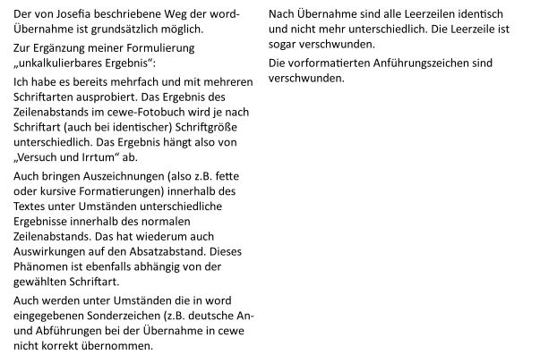 Mann kann den aus word kopierten Text auf zwei Arten im Fotobuch einfügen. Es ergeben sich unterschiedliche Ergebnisse:a) Ins Leere auf der Fotobuchseite klicken und Text einfügen. Der Text wird dann in der zuletzt in cewe benutzten Schriftart und Größe eingefügt und nicht der in word formatierten. Der Zeilenabstand ist je nach word-Formatierung "irgendwie". b) Ein Textfeld in cewe aufziehen (die Schrifteinstellung ist dann ebenfalls entsprechend der zuletzt verwendeten) und dort den word-Text einfügen. Das Ergebnis sieht z.B. so aus: Die Schriftart ist gar nicht mehr angegeben. Die Schriftgröße ist weder 18 pt (Ursprung cewe) noch 11 pt (Ursprung word), sondern 8 pt. Und fatal: Die Abführungszeichen sind nicht mehr richtig. Josefia hat geschrieben: Im Fotobuch ändere ich dann an dieser Formatierung nichts mehr, außer der beschriebeben "Erstanpassung".