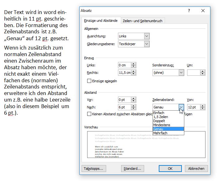 Liebe Josefia,vielleicht verstehe ich Dich nicht richtig oder ich habe mein Beispiel schlecht erklärt. Die Schriftgröße ist in word im gesamten Textblock gleich - hier 11 pt. Josefia hat geschrieben: Dort stelle ich den Zeilenabstand und den Absatzabstand ein. Die Schriftgröße stelle ich im Fließtext auf eine einheitliche Größe.