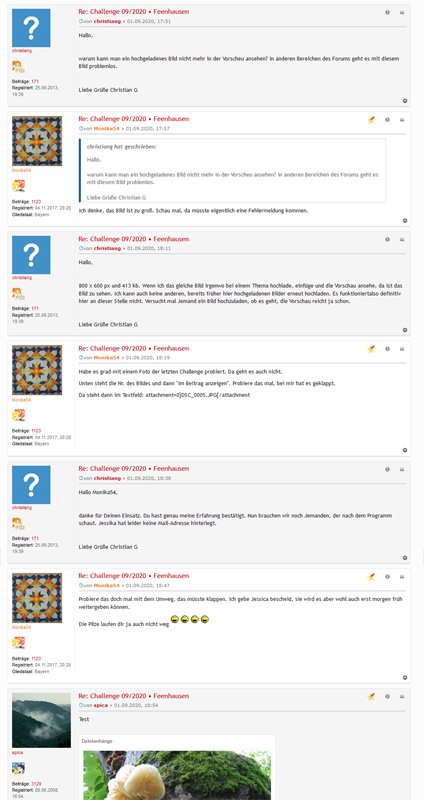 ich war ein paar Tage weg und konnte nicht antworten. Nun habe ich erneut das das Hochladen und Einstellen von Bildern in der aktuellen Challenge probiert und es klappt nun problemlos. Dreimal habe ich erfolgreich verschiedene Pilzbilder eingestellt. Besteht bei dieser Entwicklung noch ein Bedarf zur Übermittlung der erwünschten Unterlagen? Liebe Grüße Christian G Re: Forum: Bilder Upload geht nichtHallo christiang,