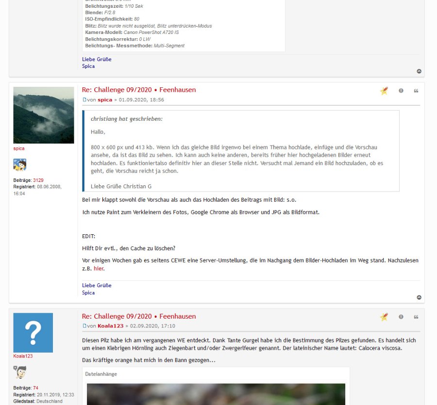 ich war ein paar Tage weg und konnte nicht antworten. Nun habe ich erneut das das Hochladen und Einstellen von Bildern in der aktuellen Challenge probiert und es klappt nun problemlos. Dreimal habe ich erfolgreich verschiedene Pilzbilder eingestellt. Besteht bei dieser Entwicklung noch ein Bedarf zur Übermittlung der erwünschten Unterlagen? Liebe Grüße Christian G Re: Forum: Bilder Upload geht nichtHallo christiang,