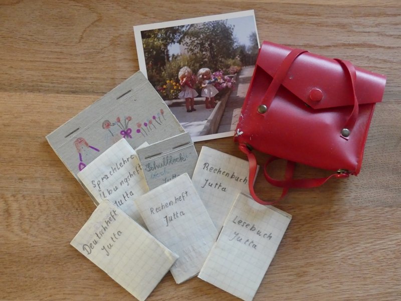 Kunigunde Re: Challenge 11/2020 • Für immer mein!Das sind die Puppen von meiner Schwester und mir, Ingrid und Jutta hiessen sie. Zur Einschulung meiner Schwester bekamen sie auch Schultüten und Büchertaschen. Als grosse Schwester habe ich für sie Schulsachen gebastelt, Hefte und Bücher, Notizblöcke und Zeichenblöcke. Eine kleine Büchertasche und ein Foto davon haben die Zeit überdauert.