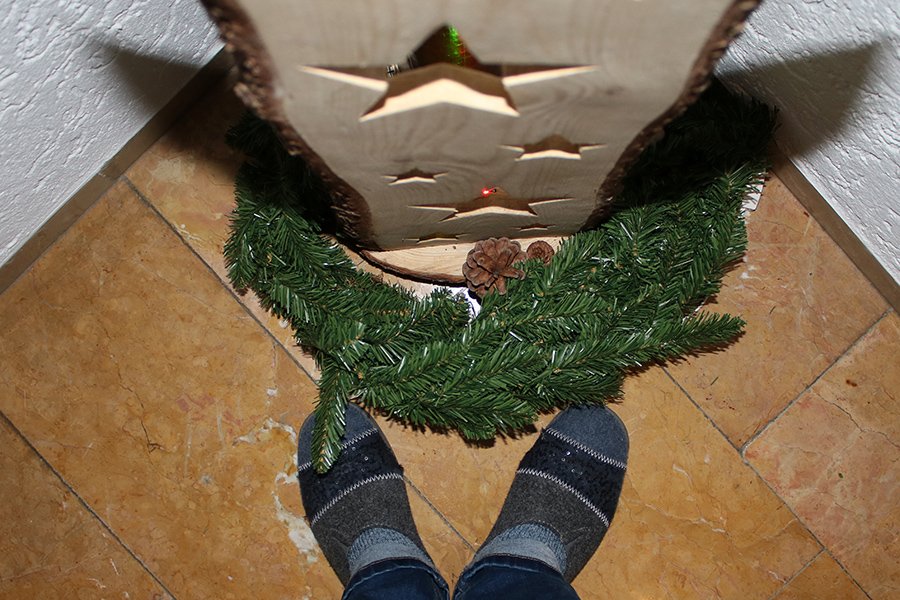 Re: 06. Dezember | Kategorie: FotografieIm Treppenhaus; meine altgedienten und heißgeliebten Hausschuhe bei ein bisschen weihnachtlicher Umgebung: