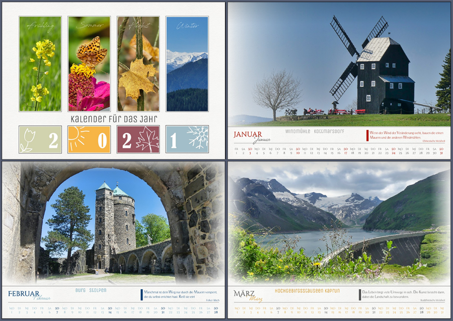 Ich hatte vor ein paar Jahren einen Kalender für eine Freundin gestaltet - den möchte ich irgendwann auch für mich machen. Mit Fotos aus einem Land, das mein Herz berührt hat und mit klugen Sprüchen, die mich immer wieder motovieren. Ich habe schnell mal etwas gebastelt und ein paar Blätter auf 2021 umgebaut. 1399 ist übrigens auch richtig Re: 12. Dezember | Kategorie: KreativesMein Kalender mit Motiven aus dem letzten Jahr