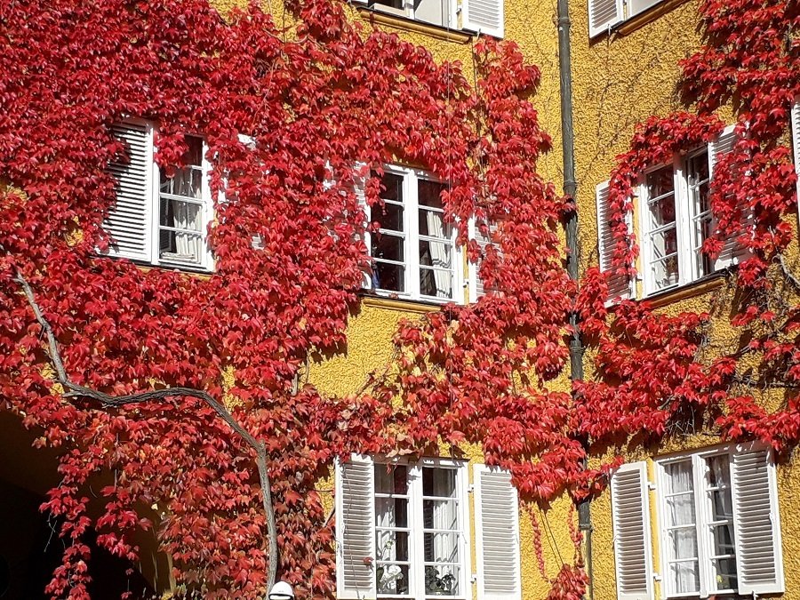 Mit schönen Grüßen aus Wien, genauer vom Grab der Johanna Dohnal, Österreichs legendärer erster Fraueministerin, am Zentralfriedhof. Re: Challenge 10/2021 • Ohne Rot ist alles unbunt!Der rote Blättervorhang ziert die Hauswand.