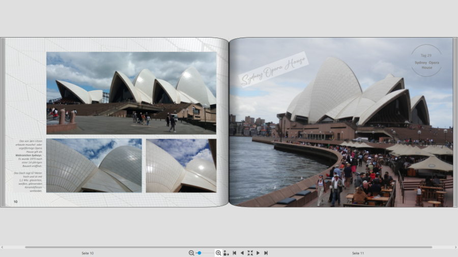 Re: Anregungen für neues Fotobuch SydneyRechtsbündig würde ich nur kurze Fakten setzen, keinen Fließtext, da es nicht der natürlichen Leserichtung entspricht. Die Detailaufnahmen vom Dach unterscheiden sich offenbar nur durch den Lichteinfall und minimal im Ausschnitt. Daher würde ich eines dieser Bilder weglassen und an dessen Stelle den Text platzieren.