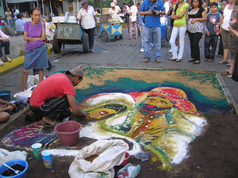 Nele Re: CEWE Photo Award 2025 - Challenge: Reise & KulturIn Leon in Nicaragua gibt es an Karfreitag einen ganz besonderen Brauch: Die Menschen legen aus gefärbten Sand und Sägespänen bunte "Teppiche" (Alfombras) mit christlichen Motiven auf die Strassen. Es kommen viele Zuschauer, viele Anwohner verkaufen Essen und Getränke am Strassenrand und es ist richtige Volksfeststimmung. Abends bei Einbruch der Dunkelheit zieht dann die grösste der zahlreichen Prozessionen von der Kirche San Juan Bautist de Sutiava über die Kunstwerke.