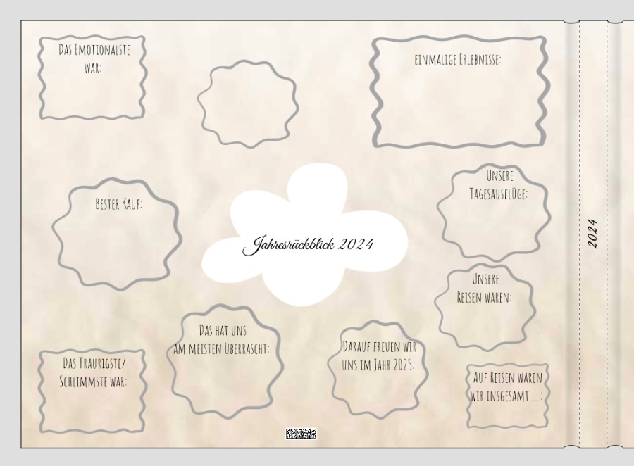 Ich muss sagen, die Idee mit den Wortwolken find ich richtig richtig gut und würde zu unserem Jahrbuch super passen Ich baue die Rückseite jetzt so bisschen auf wie ein Tagebuch-Eintrag, nur dass es für ein ganzes Jahr gilt: Diese Überschriften hab ich bereits: - Das Emotionalste war: … - Das Traurigste/ Schlimmste war: … - Das hat uns am meisten überrascht: - Einmalige Erlebnisse: … - Unsere Tagesausflüge: … - Unsere Reisen waren: … - Auf Reisen waren wir insgesamt … : … Tage - Bester Kauf: - Darauf freuen wir uns im Jahr 2025: Welche Überschriften fallen Euch noch ein, welche ein Jahr besonders machen oder zu erwähnen sind? Freue mich schon auf eure Vorschläge! Re: Buchdeckel - Rückseite vom BuchIch schon wieder