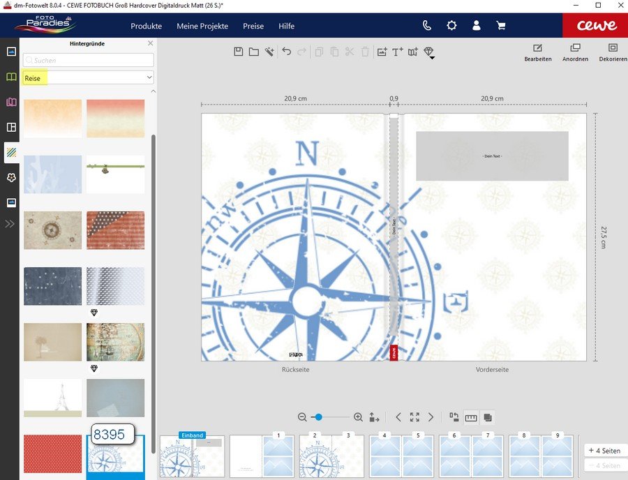 Da hat wohl eher etwas mit dem gewählten Fotobuch-Format zu tun. Bei einem quadratischen Fotobuch ist es so wie von spica beschrieben.Beim Format "Groß" hingegen wird der Hintergrund 8395 in der Kategorie Reise angezeigt und kann sowohl auf den Innenseiten als auch auf dem Cover wahlweise auf einer Einzel- oder einer Doppelseite verwendet werden.