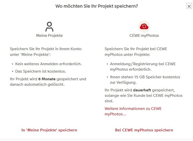 Hallo gsusenburger,Einmal habe ich es hinbekommen. Jetzt nochmal ein neues Projekt online gestartet. Wenn ich jetzt auf Speicher klickse bekomme ich immer nur als Speicherort meine lokalen Festplatten angeboten. was genau möchtest du eigentlich erreichen, was ist dene Wunschvorstellung zur Bearbeitung von Fotobuchprojekten? Welchen Vorteil versprichst du dir von der Nutzung von CEWE myPhotos? Meines Erachtens bietet sich CEWE myPhotos an, wenn man Projekte mit anderen teilen oder im Wechsel gemeinsam gestalten will. Auch zur Übertragung von Projekten auf eine andere eigene Hardware bietet sich der Weg über Cewe myPhotos an. Außerdem kann CEWE myPhotos als "externes Archiv" für lokal mit der Desktop-Software gestaltete Projekte dienen. Wenn man irgendwann mal wieder auf das zwischenzeitlich lokal gelöschte Projekt zurückgreifen will, kann man sich die Daten von CEWE myPhotos zurückladen. Für alle genannten Fälle gilt ja aber, dass man zur Bearbeitung den Projektstand samt Fotos erst wieder lokal verfügbar machen muss. Wenn du ein Projekt online gestaltest, hast du die oben schon beschriebene Möglichkeit, dass Projekt beim Handelspartner (zeitlich beschränkt) oder dauerhaft in deinem CEWE myPhotos-Konto zu speichern. Auf eine Online-Gestaltung kann man ja aber eigentlich verzichten, wenn man die Desktopsoftware installiert hat, zumal diese komfortabler zu bedienen ist und einen sehr viel größeren Funktionsumfang hat. Wer ist online?Mitglieder in diesem Forum: 0 Mitglieder und 40 Gäste