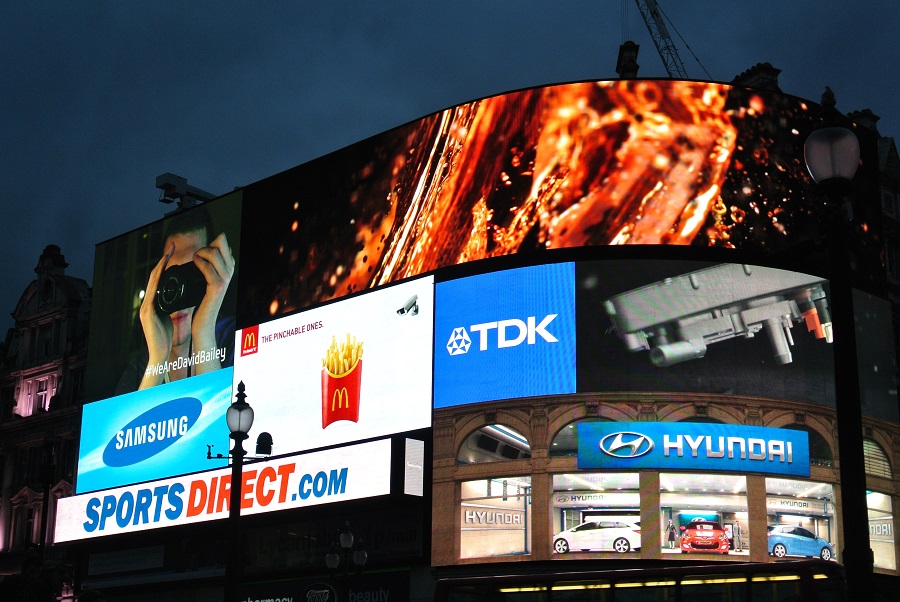 In London "Piccadilly Circus". Ist nachts noch imposanter wie tagsüber, wenn sich die Werbung in den Schaufensterscheiben spiegelt