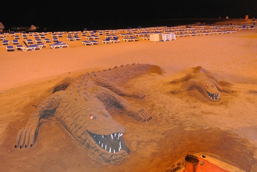 Silber-Distel Re: Challenge 07/2014 • NachtschwärmerNachtschwärmerei am Strand von Los Cristianos auf Teneriffa mit aufwendig gestalteten "Sandburgen" und sonstigen Formen.